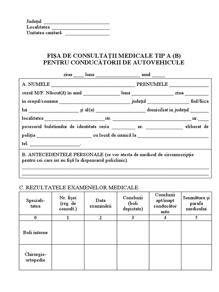 Normele privind examinarea medicală a conducătorilor de vehicule şi a candidaţilor pentru obţinerea permisului de conducere capitolul i dispoziţii persoanelor recunoscute apte pentru conducerea vehiculului cu unele restricţii, în adeverinţa medicală de prezentare la inspectoratul auto de stat (f. Atat obtinerea permisului auto, cat si preschimbarea permisului presupun efectuarea fisei de consultatii medicale tip a(b). Pentru inceput, este important sa stii ca fisa medicala pentru permis auto este necesara atat la obtinerea pentru prima data a permisului, cat si la schimbarea celui expirat.