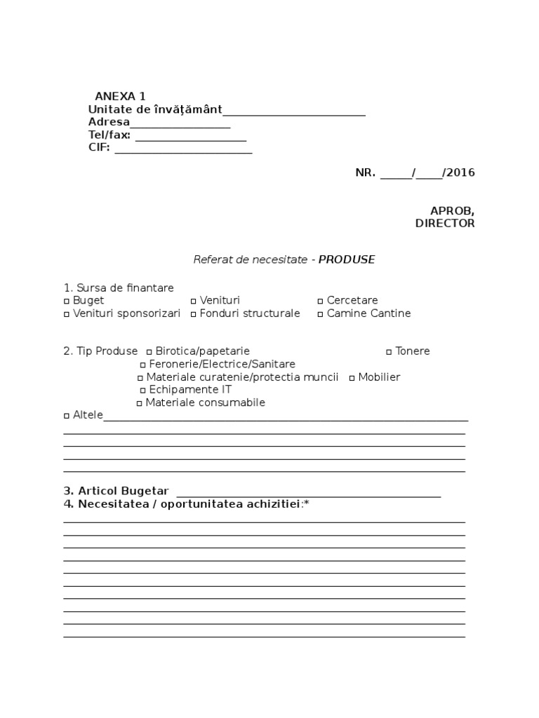 Vă rugăm prin prezenta să aprobaţi achiziţionarea următoarelor produse/servicii: Descrierea necesităţii um cantitate fără tva cu tva fără tva cu tva. Consulta modelul de referat cheltuieli protocol.