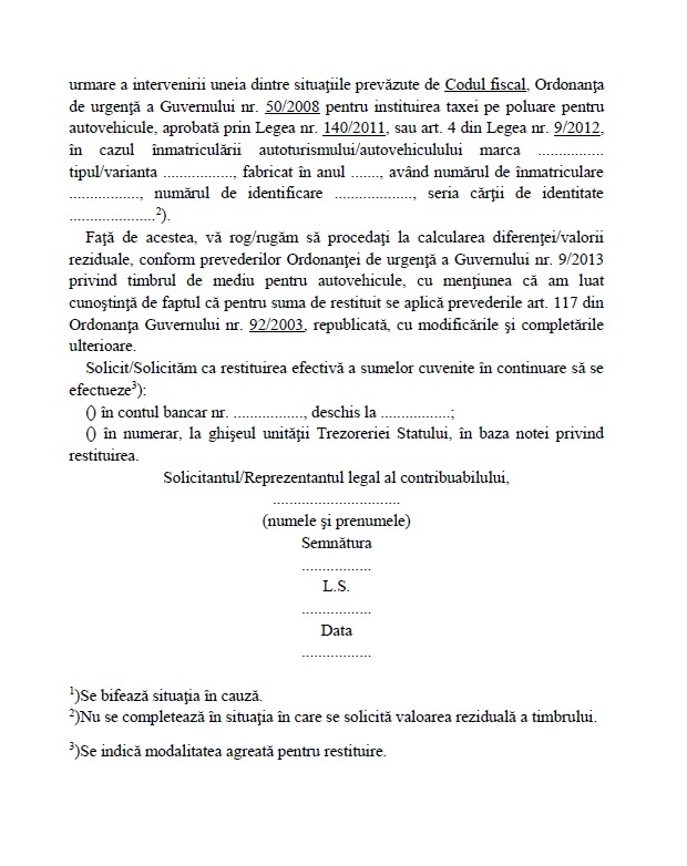 Pe lângă restituirea taxelor auto, statul va trebui să achite şi dobânzile cererea de restituire pentru taxa auto se soluționează prin decizie emisă de către anaf, iar restituirea sumelor se realizează, în baza. Cerere de restituire a sumelor reprezentând taxa specială pentru autoturisme şi autovehicule, taxa pe poluare pentru autovehicule, taxa pentru emisiile poluante provenite de la autovehicule şi timbrul de mediu pentru autovehicule 45 de zile, termenul în care fiscul trebuie să soluționeze cererea de restituire.